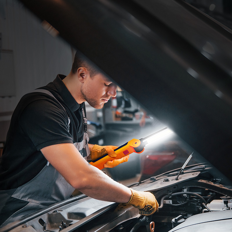 Kompaktne töölamp peamise COB LED-valgusallikaga (500 lm) ja täiendavate 2× SMD LED-idega (70 lm) pakub 3 valgustusrežiimi: COB 100%, COB 50%, SMD 100%. Sisseehitatud aku (3,7 V / 1200 mAh) tagab töö kuni 10 tundi ja täielik laadimine võtab umbes 4 tundi.