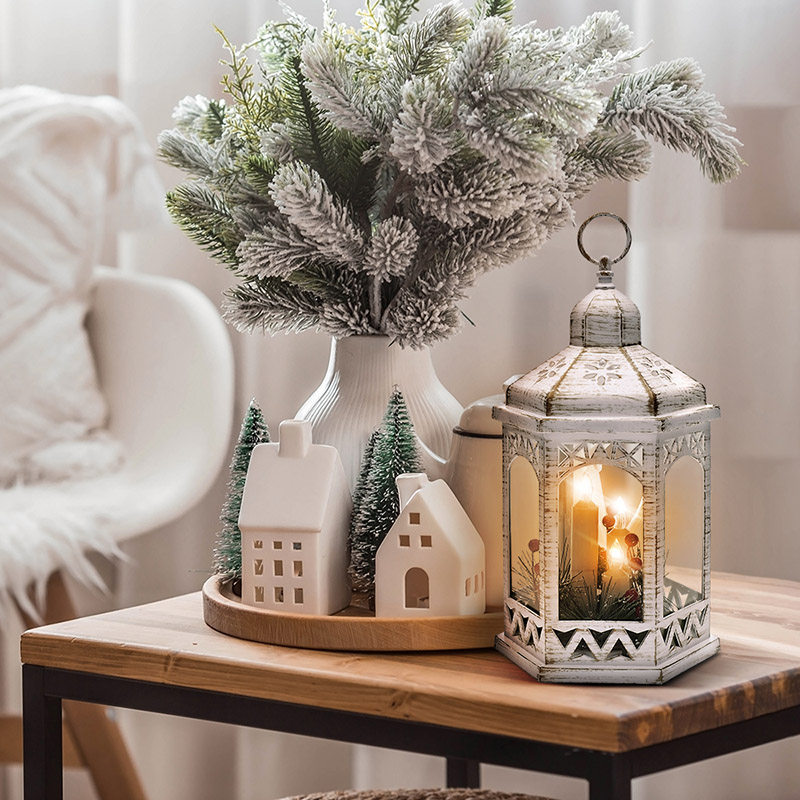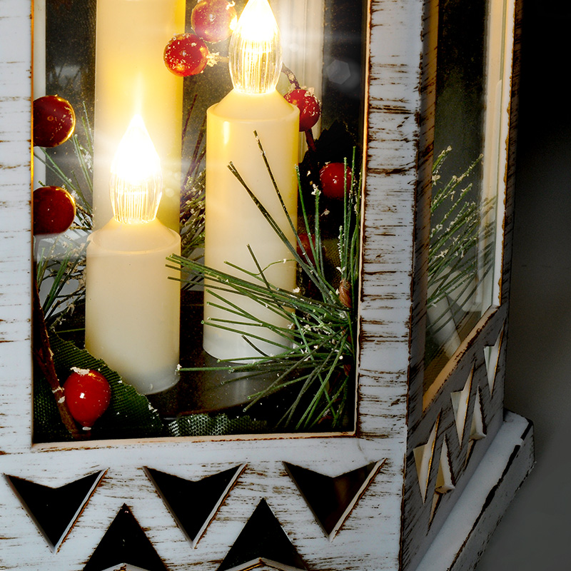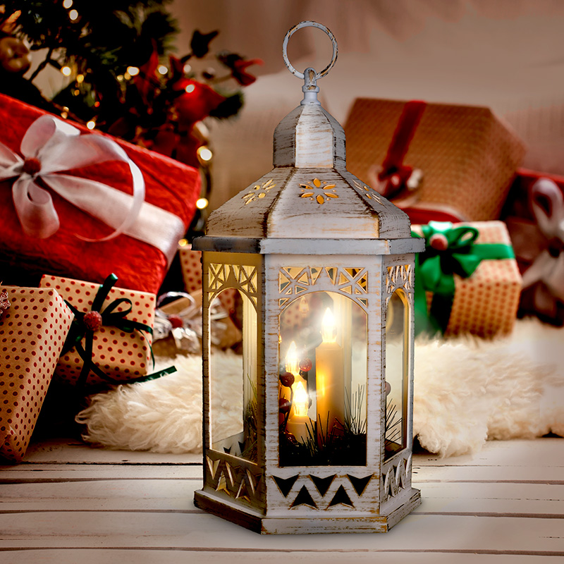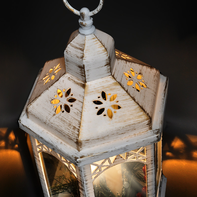- Valge jõululatern kolme LED-küünla ja kaunistustega