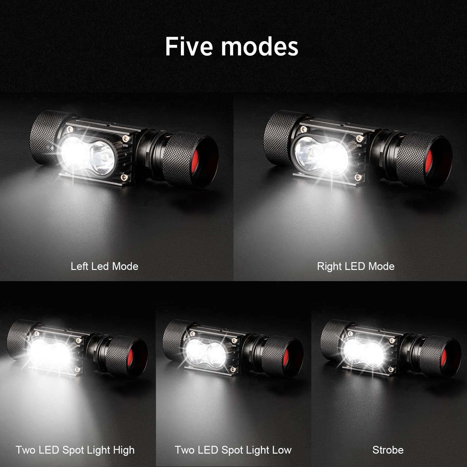 - 5 valgustusrežiimi: parem LED 100%, vasak LED 100%, mõlemad LED-id 100%, mõlemad LED-id 50%, vilkuv