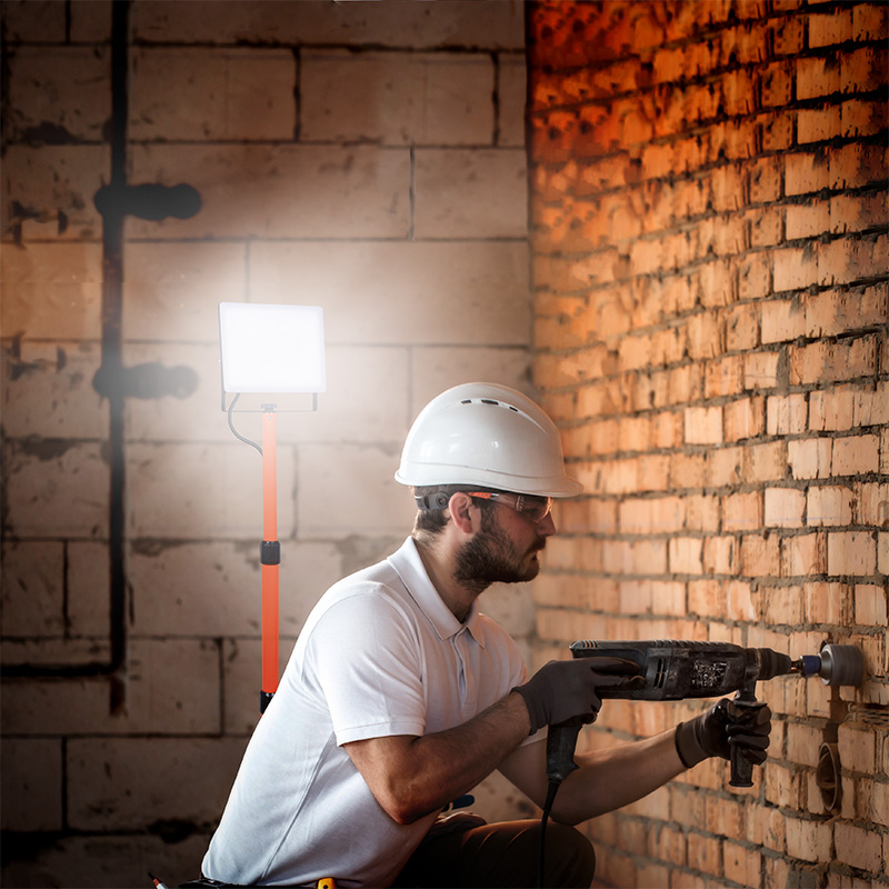 Tänu pikendatavale teleskoopjalale (kõrgus kuni 162 cm) sobib prožektor ideaalselt ehitusplatsidele, töökodadesse või väliüritustele. Vastupidav valatud alumiiniumist disain IP65 kaitseklassiga tagab kaitse vee ja tolmu eest. Prožektor on varustatud toitejuhtmega (1,5 m), LED-i eluiga on 30 000 tundi ja CRI > 80.