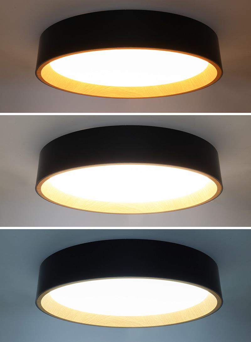 Elegantne must disain koos sisemise rõnga puiduimitatsiooniga annab interjöörile meeldiva ja loomuliku ilme. Tänu kaugjuhtimispuldile saate hõlpsalt reguleerida valguse intensiivsust, temperatuuri (3000K – 6500K) ja valikut eelseadistatud valgustusrežiime, mis võimaldavad teil atmosfääri vastavalt oma vajadustele kohandada.