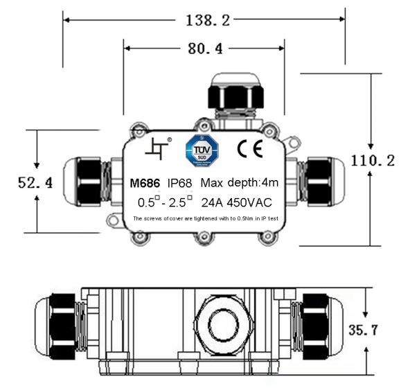 Karp talub kuni 450 V vahelduvvoolu ja kuni 24 A voolu. See on mõeldud 5–12 mm läbimõõduga kaablitele ja 0,5–2,5 mm² ristlõikega juhtmetele. Vastupidav konstruktsioon (138 × 78 × 35 mm) võimaldab kasutamist isegi ajutisel kuni 3 m sügavusele sukeldumisel. Usaldusväärne valik professionaalseteks ja hobipaigaldusteks.